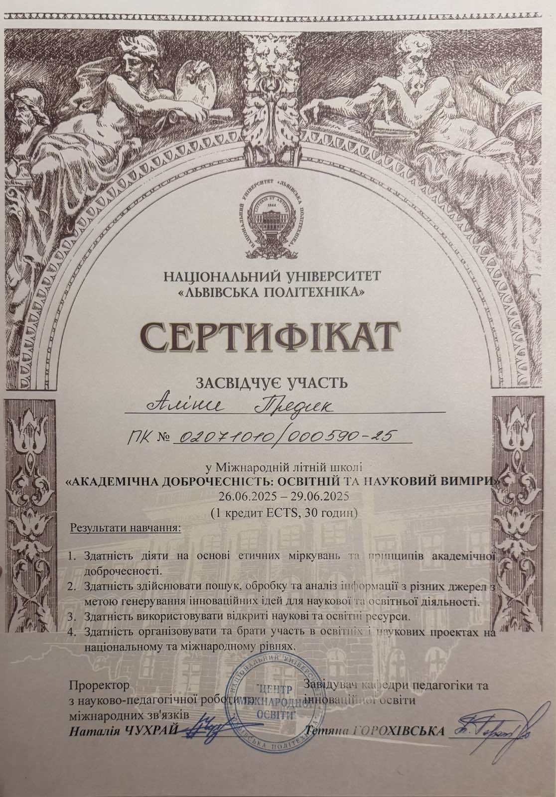 - Предик А.,Соломон Х. (2025) Роль самодисципліни у формуванні навичок тайм-менеджменту науковця. Освіта для ХХІ століття: виклики, проблеми, перспективи: матеріали VІ Міжнародної науково-практичної конференції (26 грудня 2024 року, м. Суми). Суми: Вид-во СумДПУ імені А. С. Макаренка, 2025. 285 с. С.167-170.